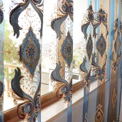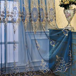 Luxo Jacquard Cortinas Sheer para sala e quarto com elegante bordado Tulle Design em Azul 52x96 polegadas