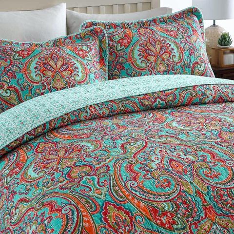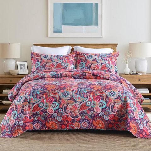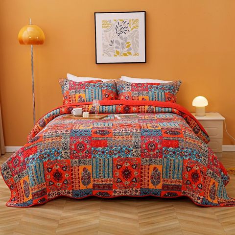 Conjunto De Colcha De Algodão Reversível King Size Cobertura De Cama Floral Paisley Vermelho Boêmio