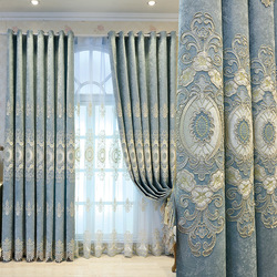 Azul Europeia Cortinas Sheer com bordado floral dourado Projeto Rod bolso para Sala de Jantar Quarto